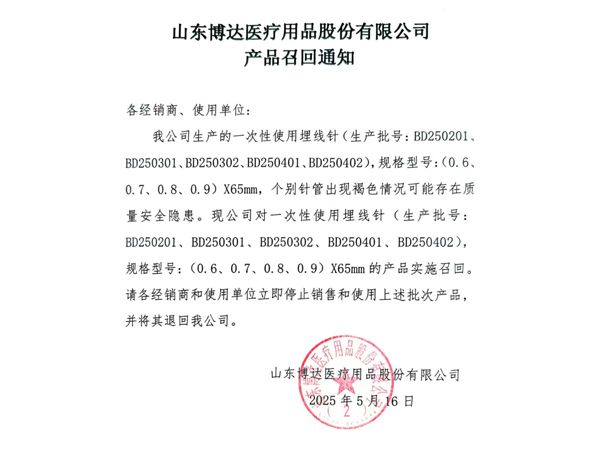 山東博達醫療用品股份有限公司是生產可吸收性外科縫線專業廠家,主要產品有可吸收縫合線 、內窺鏡圈套線、穴位埋線、快吸收美容線、醫用羊腸線 膠原蛋白線以先進的生物技術提取了健康哺乳動物內臟的膠原蛋白為基材,采用先進的工藝加工而成,線體的主要成分為高純度膠原蛋白,并獲得了國家發明專利,頒布了YZB/國6301-2013《可吸收性外科縫線》產品標準,并通過了ISO9001:2015和ISO13485:2016質量管理體系認證。